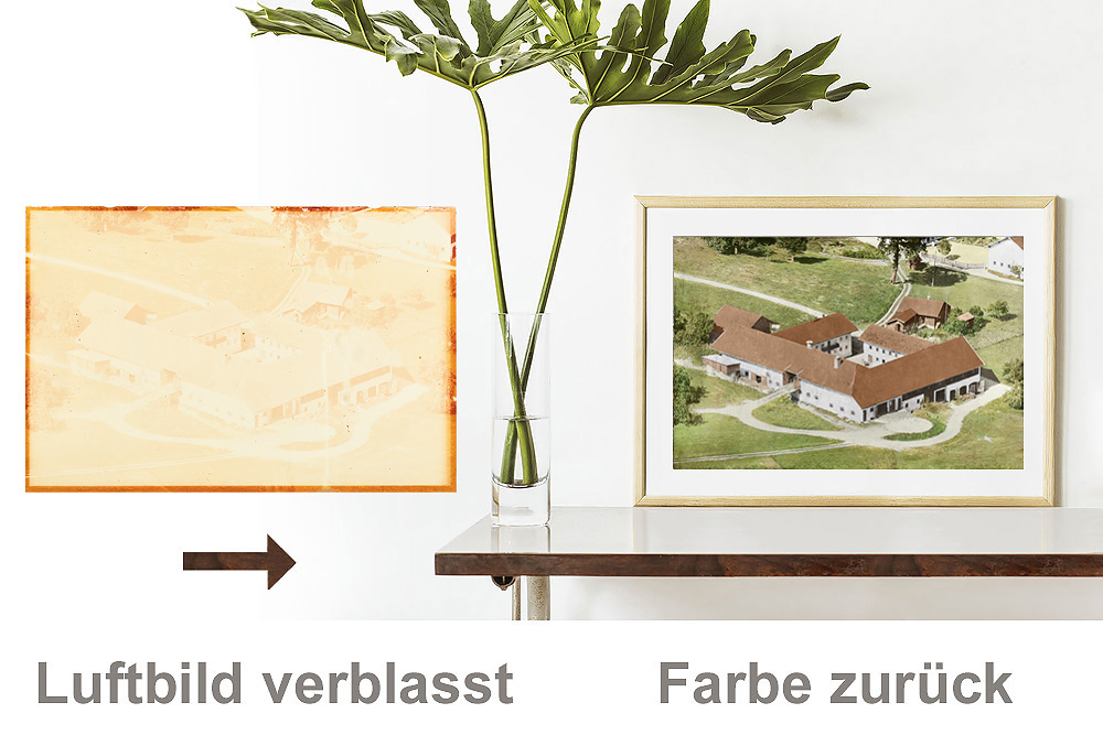 Dann war da noch die Luftbildaufnahme aus den 70´ern, welche stark verblasst war und die Originalfarben nicht mehr zu erkennen. Auch hier hat Frau Huber hervorragende Arbeit geleistet. Die Luftbildaufnahme schaut nun so aus, als ob sie erst gestern gemacht wurde.