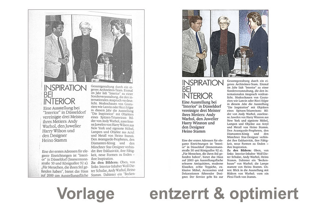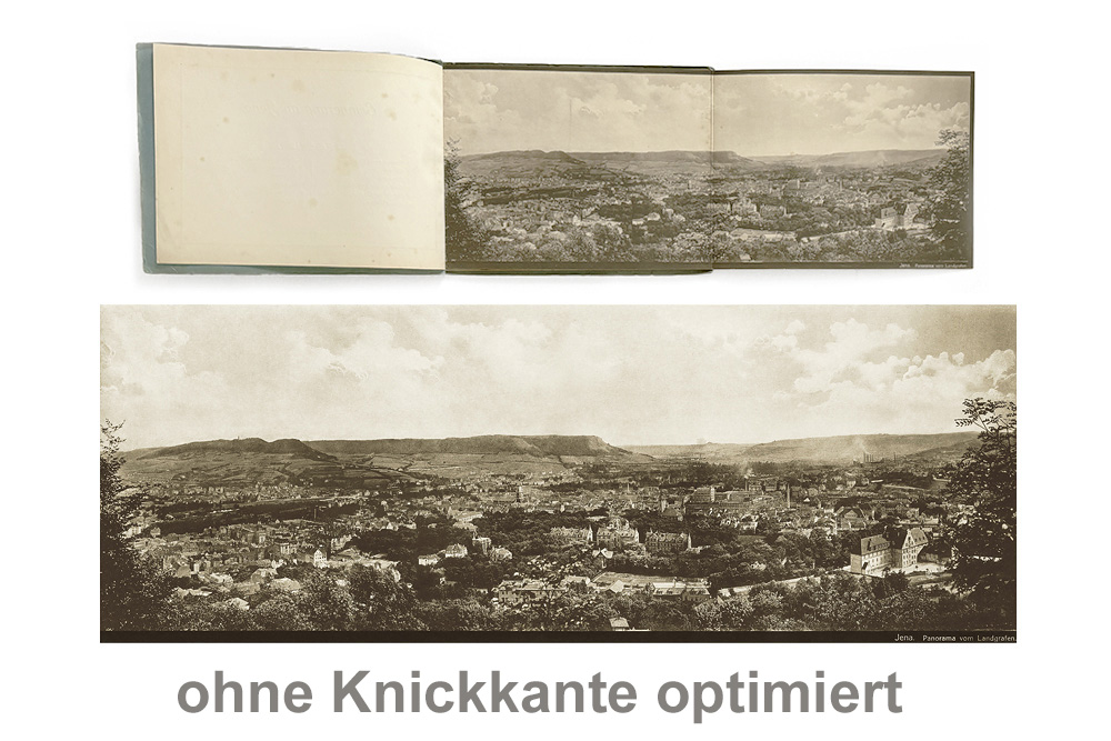 Dabei werden Falzschatten entfernt und fehlende Bildinformationen rekonstruiert. Das Original bleibt dabei unberührt.