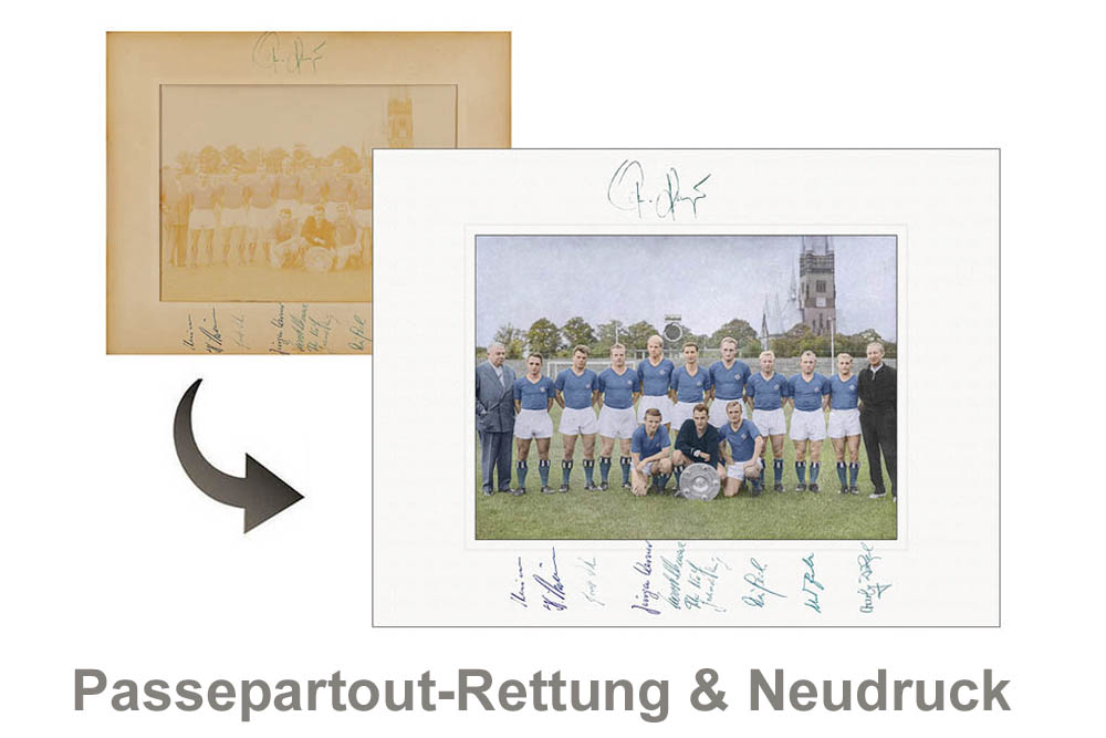 Ein neues, gedrucktes Passepartout mit Kartonstruktur (als Erweiterung) ist ideal für Fotos, die im Original nicht im 2:3 Druckformat vorliegen: ein flächenfüllenden Druck ist dann möglich, sodass das restaurierte Foto in einen gängigen Rahmen passt. Auf Wunsch kann eine Widmung ergänzt werden.